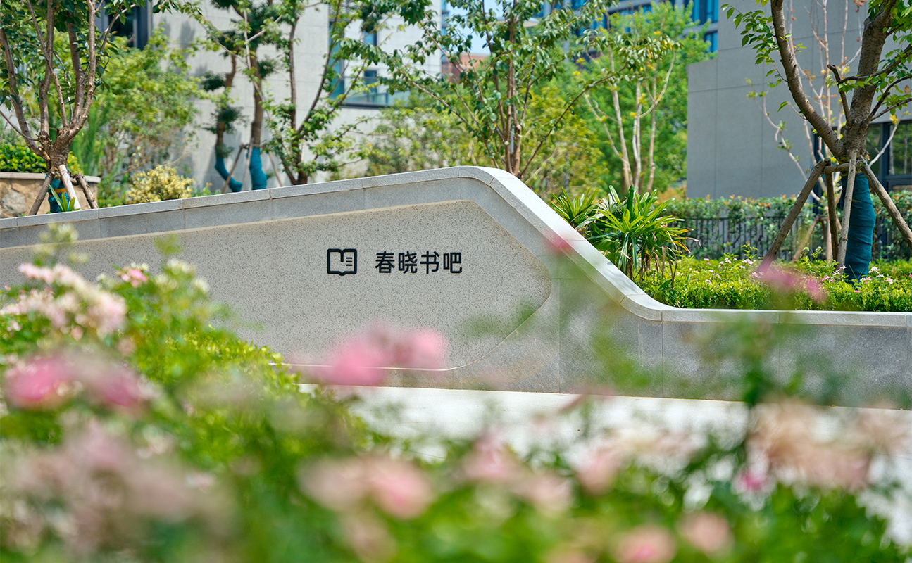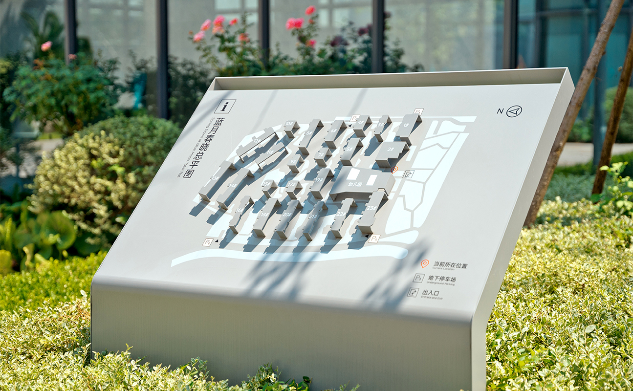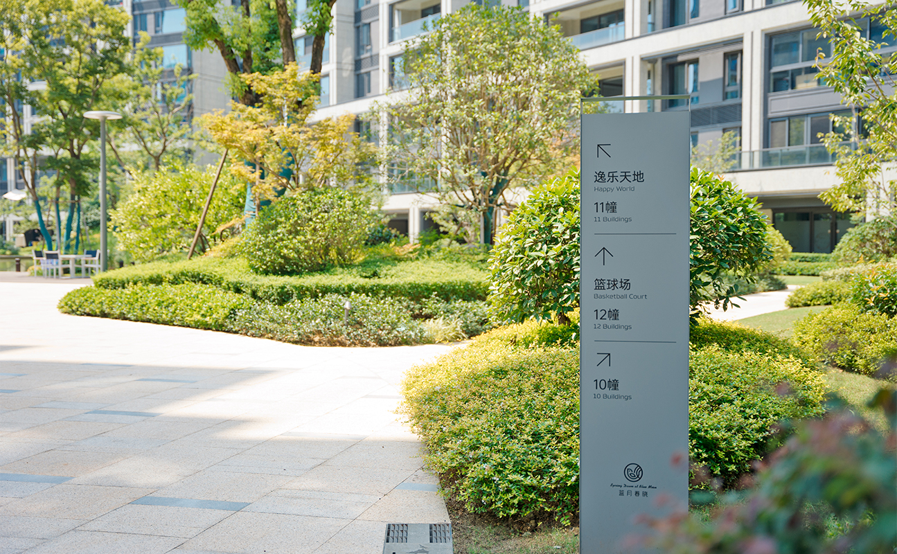 根据蓝月春晓静谧、安逸的环境特性,在此次导视设计上充分保留了原生的自然基底。叠合人与自然、自然与建筑的影像,以渗透融合的设计手法,打造宜居的生态空间。通过导视对整体空间的拼合,将人们生活中的细节融合在环境之中,形成一个静谧、舒适的居住环境。