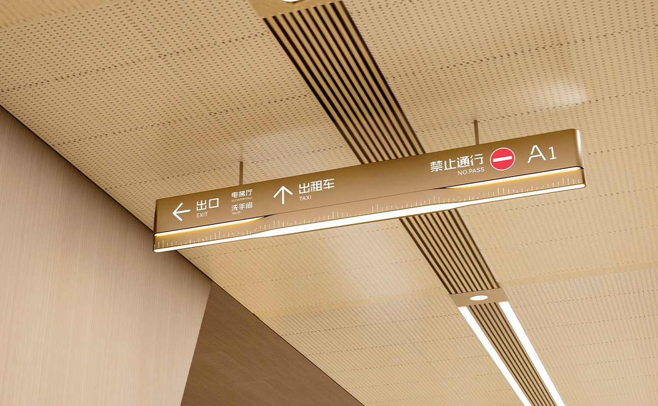 In the process of designing the wayfinding system, Shenghemei integrated the architectural design concept with Huzhou's distinctive silk and Hu brush culture. Through smooth and interwoven lines on the facades and volumes, it presents the agility and three-dimensional beauty of silk, creating a lingering artistic conception in the overall shape. Soft silk and graceful flowing water elements endow the wayfinding system with a fashionable and romantic vibe, while the visual imagery adds a touch of scholarly elegance. Thus, it shapes the image of a waterfront golden street that embodies both cultural connotations and modern aesthetics.
