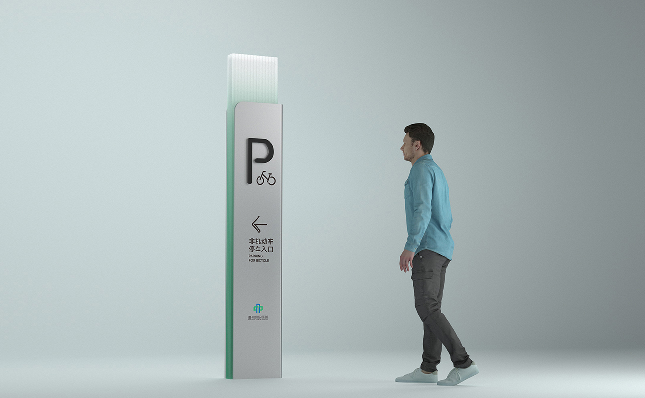 导视系统选用通透卡乐板双层造型,内容可更换,灵活适应科室调整。核心形象立招设计独特,打破传统形式,兼具辨识度与装饰性,并贯彻“指示小品化、小品指示化”理念,与景观自然融合。整体以简洁线条营造安静通透的环境,体现精致、温馨、友善的文化,兼顾实用性与体验感。